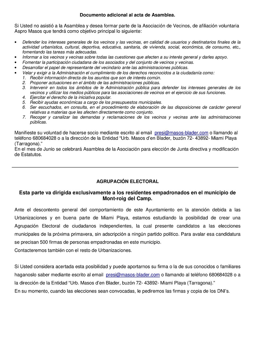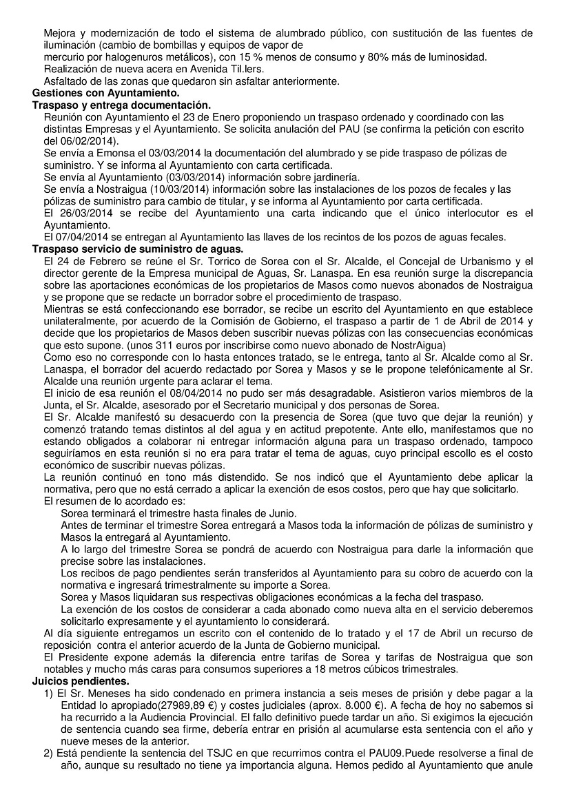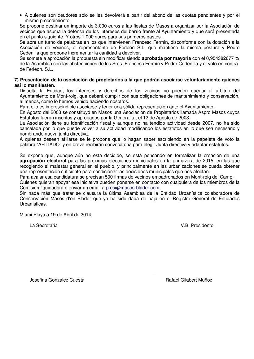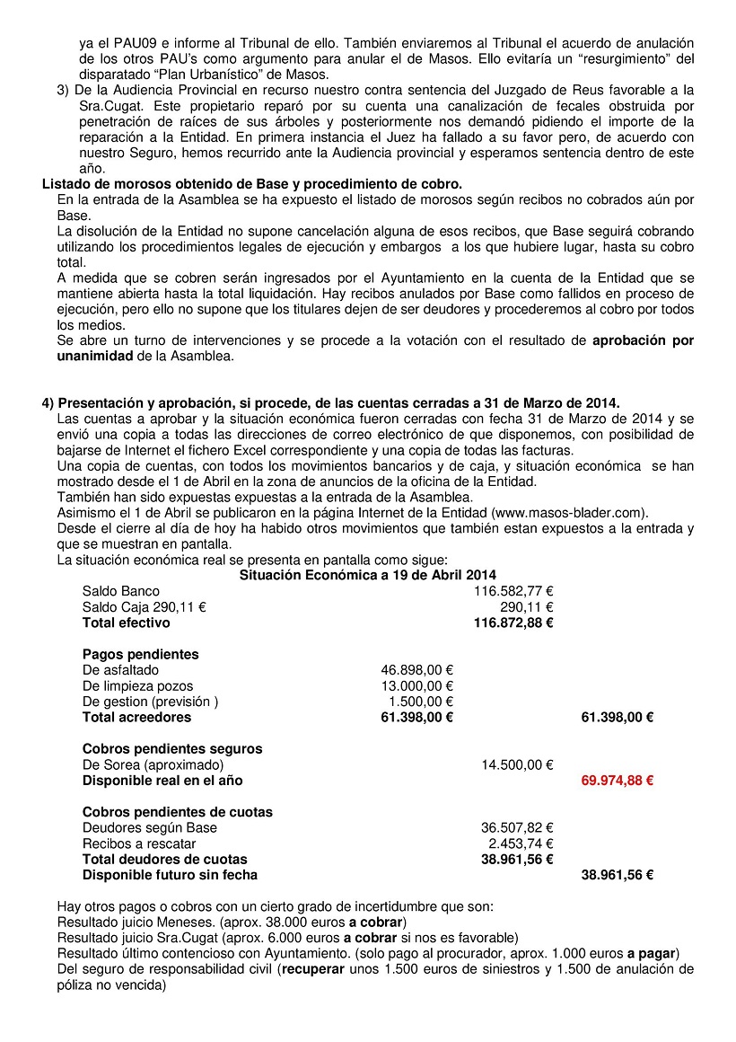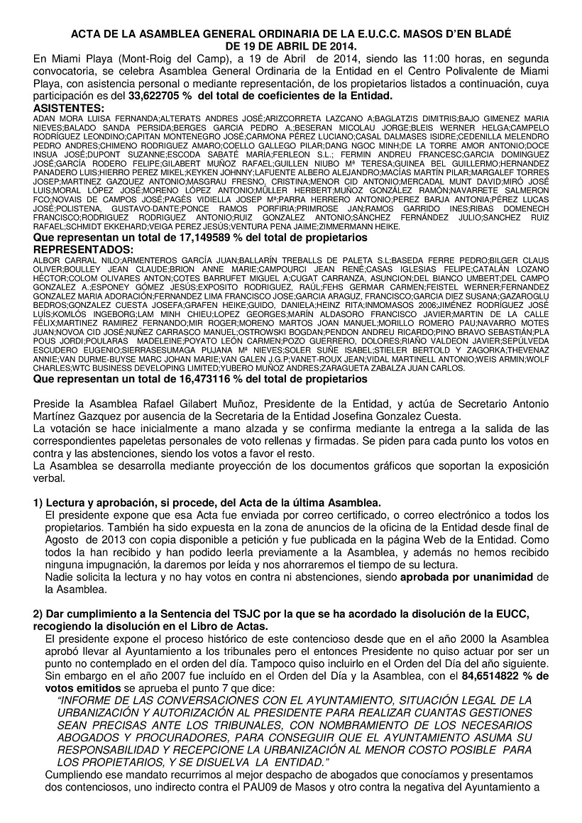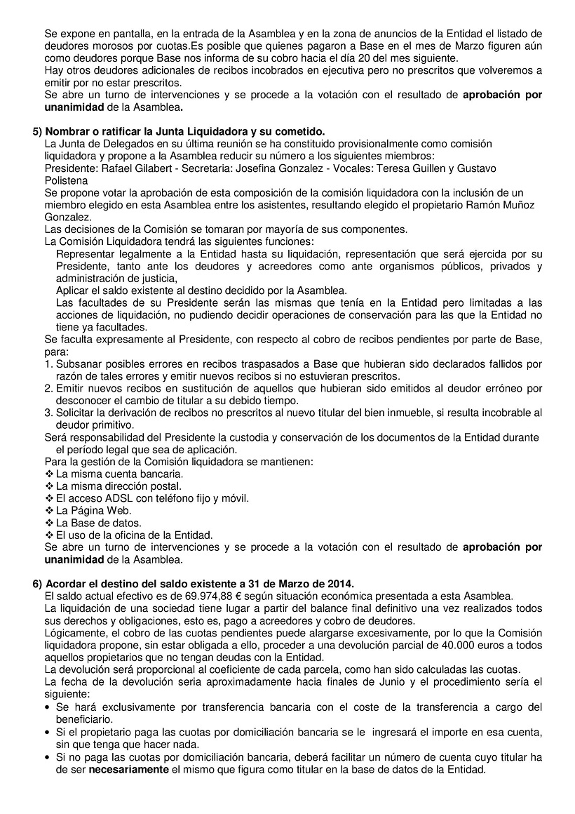 La Entidad convoca Asamblea Extraordinaria para el 19 de Abril de 2014 en la que se informa y acata la sentencia, se aprueban las cuentas a la fecha de disolución y se nombra Comisión Liquidadora para el proceso de liquidación (cobros y pagos pendientes) y para la aplicación del remanente. Abajo el Acta correspondiente.
