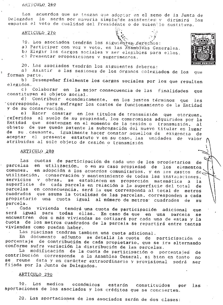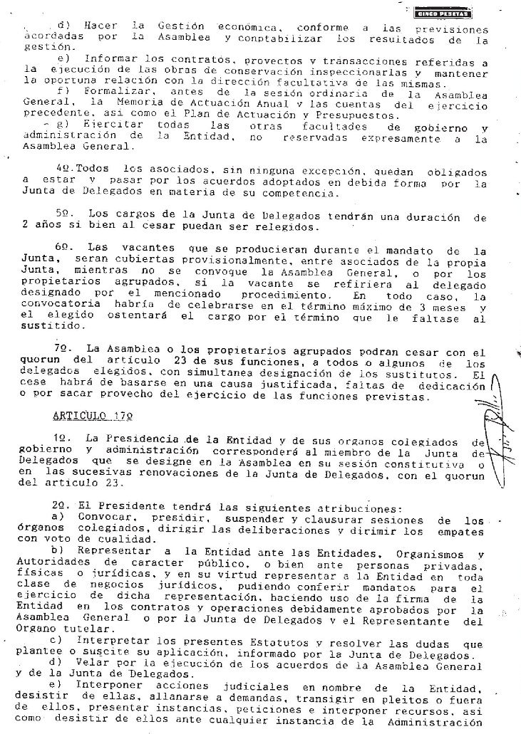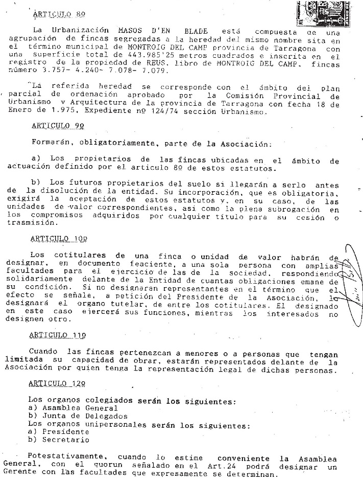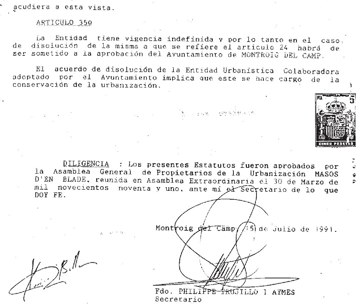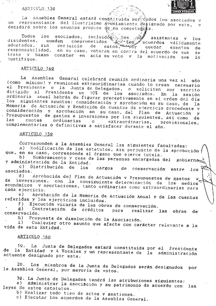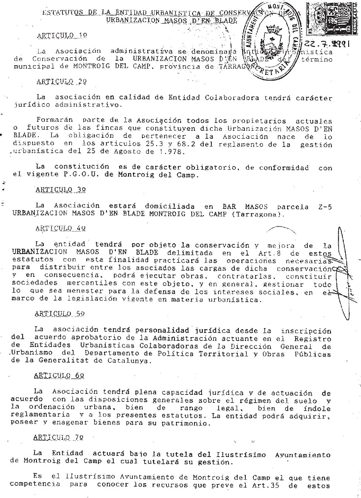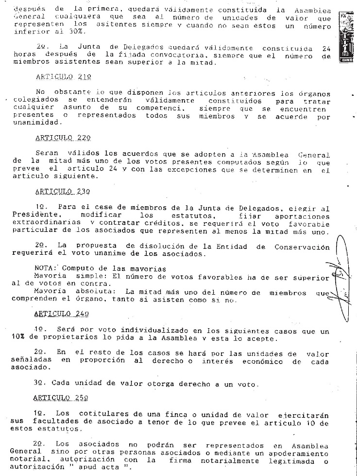 Estos Estatutos no eran aplicables a la Entidad. Fueron aprobados por una Asociación de Propietarios de afiliación voluntaria en el año 1991, y por tanto su aplicación a la Entidad era ilegal, puesto que no existía la Entidad Urbanística Colaboradora de Conservación, la cual fue aprobada e inscrita en el año 1996 y comenzó su funcionamiento con estos falsos Estatutos.